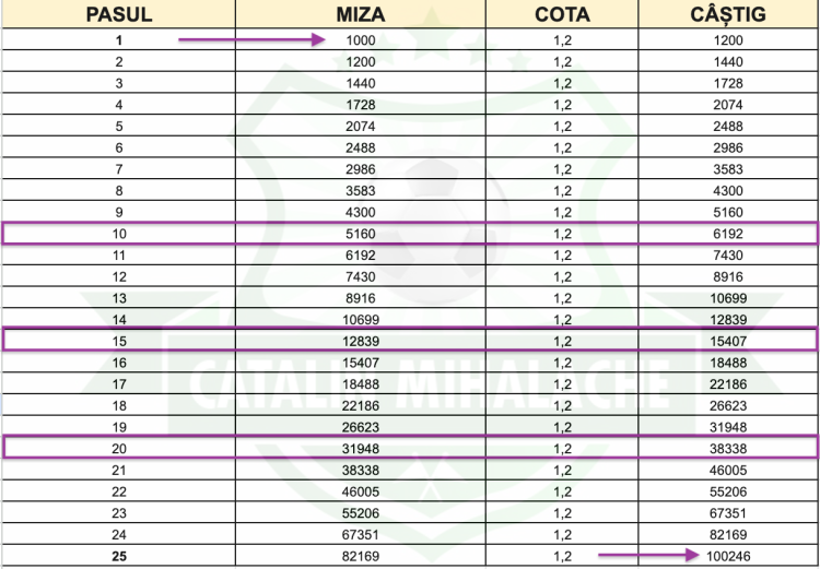 Dacă verifici imaginea de mai sus, poți verifica sumele de bani pe care le poți câștiga în funcție de numărul de pariuri câștigătoare consecutiv, prin reinvestirea câștigului în sistem ALL-IN! De exemplu, după 5 pariuri poți avea de 2.5 ori mai mulți bani în cont, iar dacă reușești provocarea supremă de 25 de pariuri consecutive, poți avea de 100 de ori mai mulți bani față de miza inițială dacă respecți STAKING PLAN-ul recomandat.