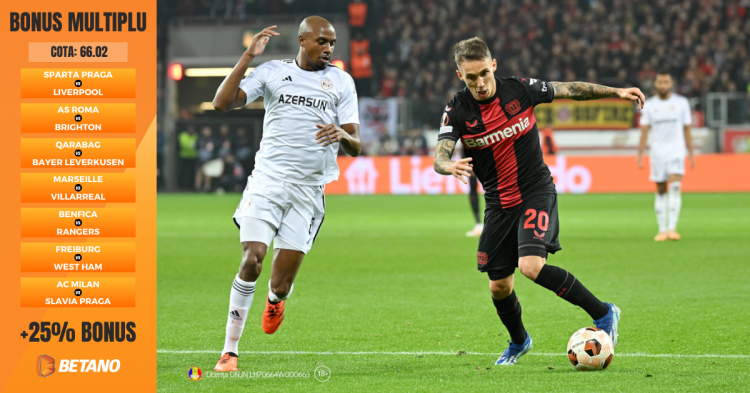Din oferta Betano din această săptămână pentru Liga Europa am ales cele șapte meciuri programate joi, 7 martie, în manșa tur a optimilor de finală și am mizat pe cote mai mari de 1.50 la fiecare joc în parte pentru a debloca astfel Bonusul Multiplu, în cazul acesta de 25%, care înseamnă un potențial câștig mai mare. La meciurile de fotbal oferta este valabilă pentru piețele Rezultat final, Total Goluri - Peste/Sub și Ambele echipe înscriu - Da/Nu.