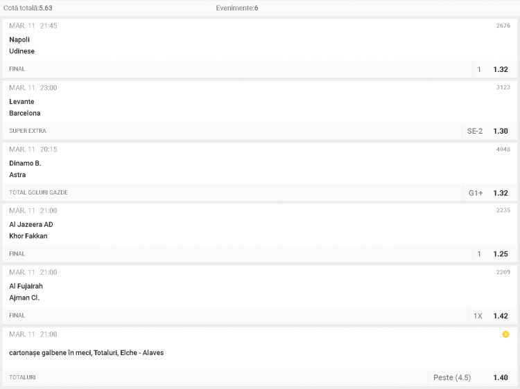 Elche - Alaves - Ultimul meci de pe acest bilet e din LaLiga, din campionatul Spaniei. Pe ”Estadio Manuel Martínez Valero”, Elche primeste vizita celor de la Alaves, intr-un meci extrem de important in ceea ce priveste retrogradarea. La un asemenea meci, cu o miza uriasa a fost delegat un central care acorda foarte usor cartonase galbene, iar in ultimele 5 dueluri directe dintre Elche si Alaves nu am avut niciodata sub 5 avertismente. Mizez pe multe cartonase astazi, avand in vedere importanta partidei.