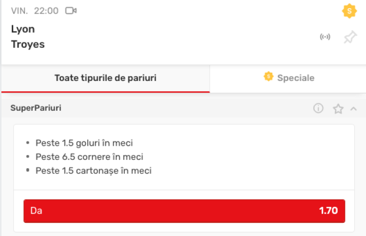Pe Superbet, pariul combinat peste 1.5 goluri, peste 6.5 cornere și peste 1.5 cartonașe are cota @1.70.
